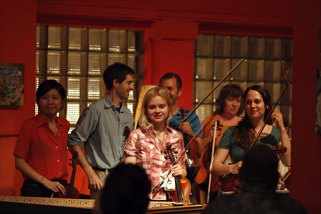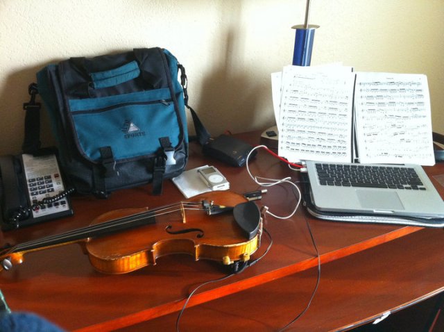 The orchestra was unrehearsed, but some of us prepared. This is Brendan Ratchford’s set-up on the road. He’s both an airplane pilot and a violinist.